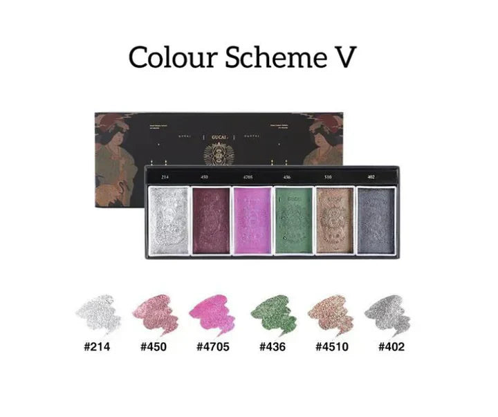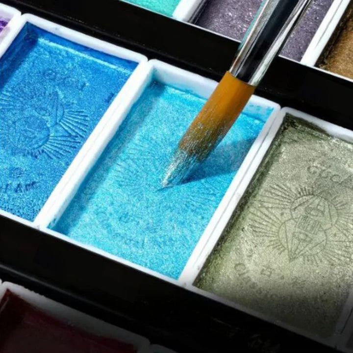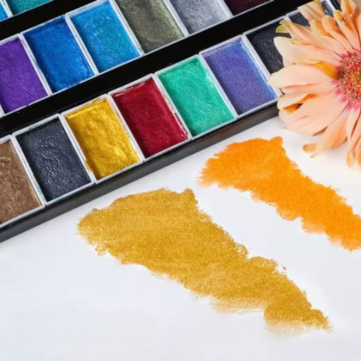 Watercolor paint set in a variety of traditional classic colors, each with a unique shimmering effect. With dazzling glitter effects and finishes, let's enjoy the unique excitement of painting!